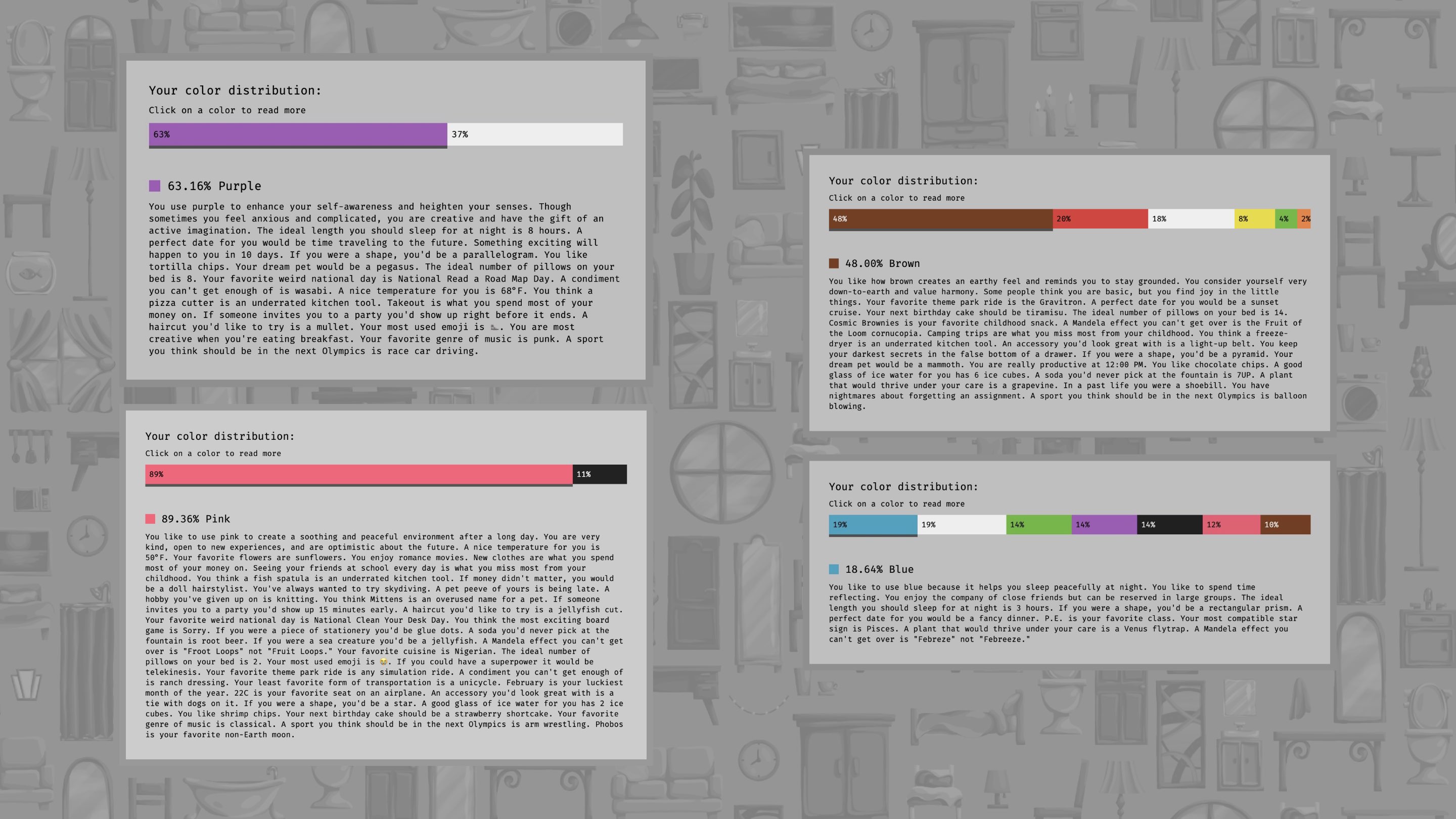 Based on how users decorate the apartment, they will receive different results. Each item they place will trigger a unique sentence to appear in their results.