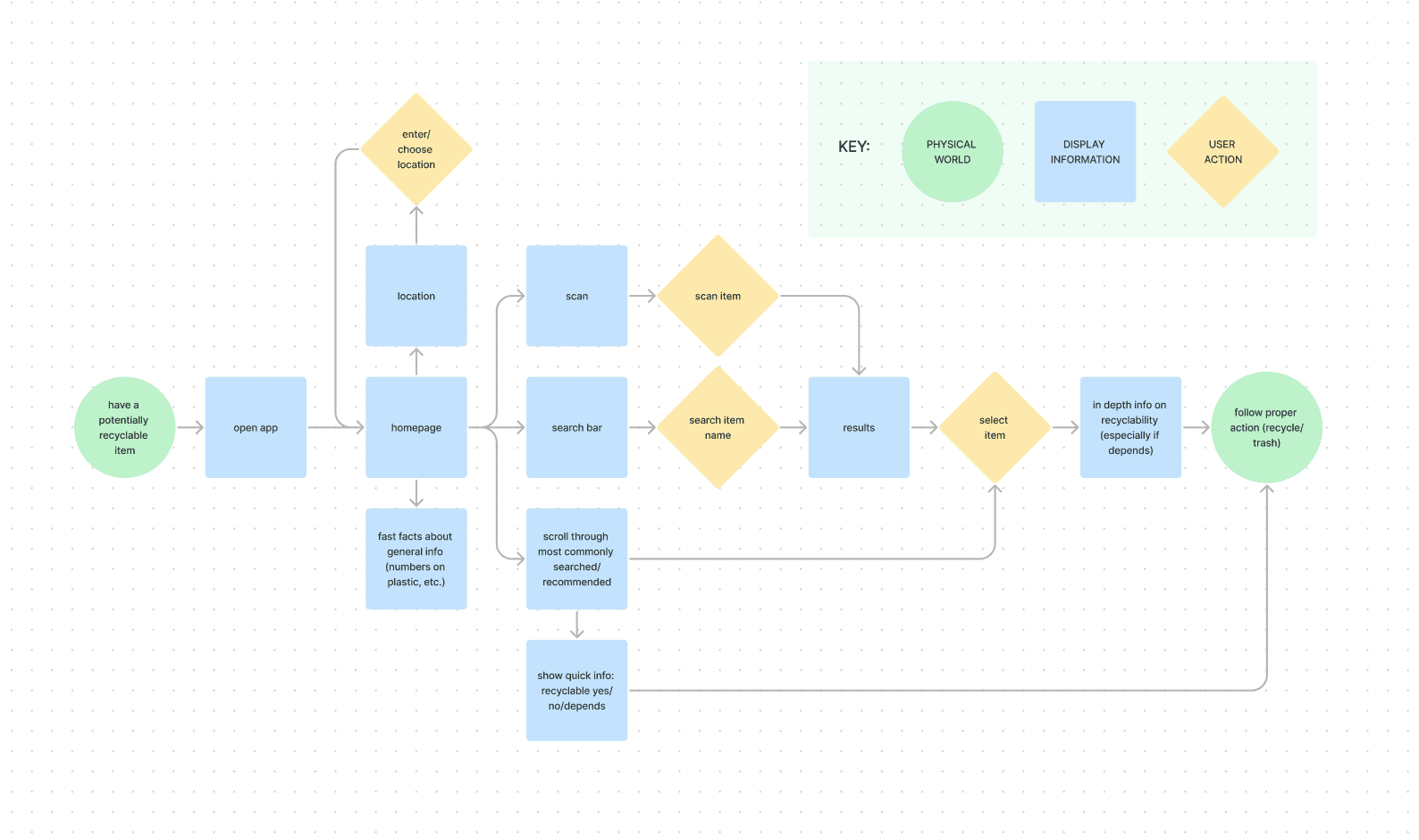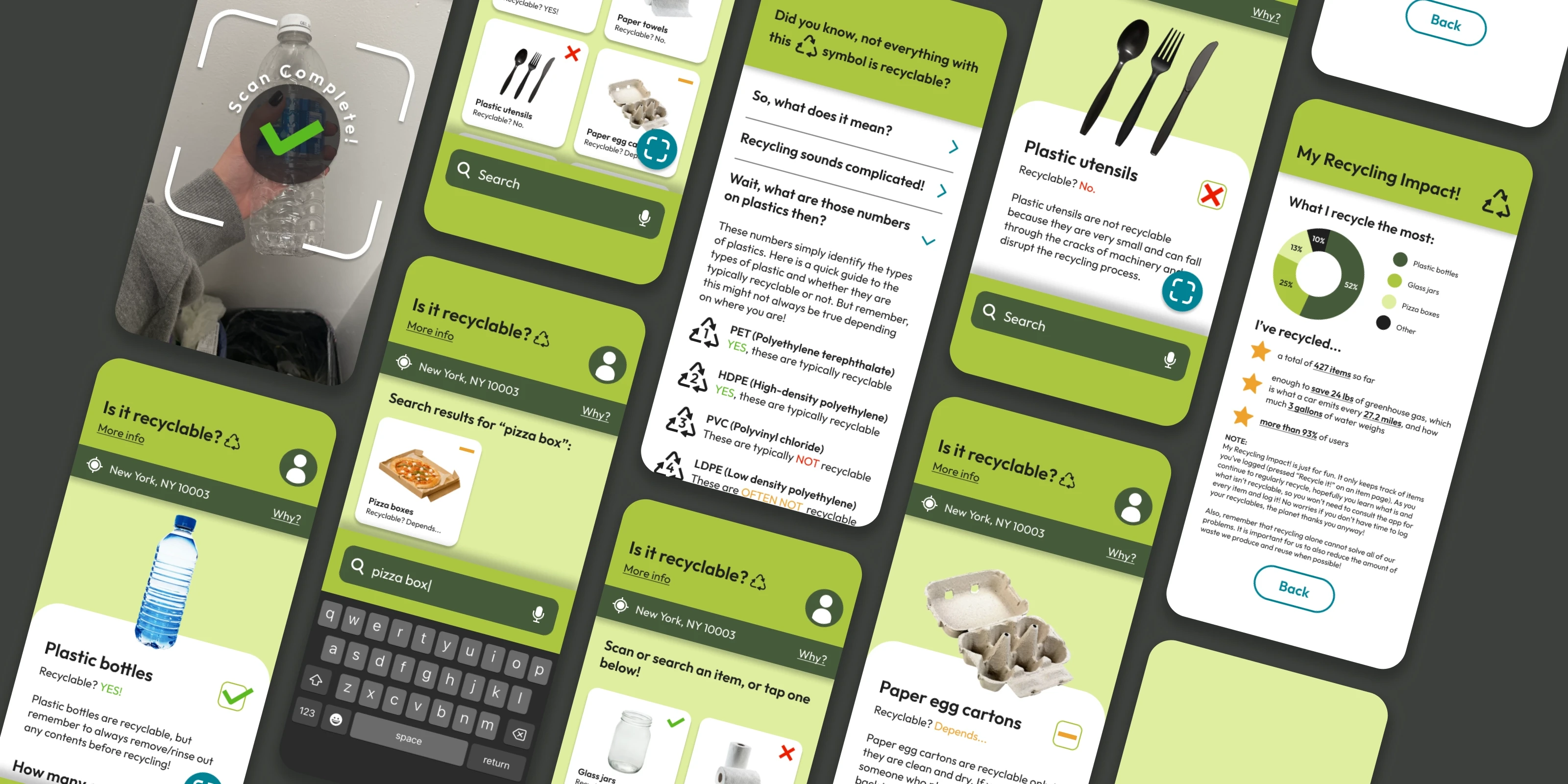 From final testing and presentation feedback, people responded well to the user journey and the convenience of use. I was surprised at how many people liked the "My Recycling Impact!" tracker because my focus was to streamline the "research" process people go through when finding out whether something was recyclable or not. It was intended to be a fun & personalized side feature that was completely optional because tracking what you recycle adds another step to the process. Also, ideally the more you recycle, the less you will have to use the app. However, people said this would encourage them to recycle more to see how much of an impact they could make.